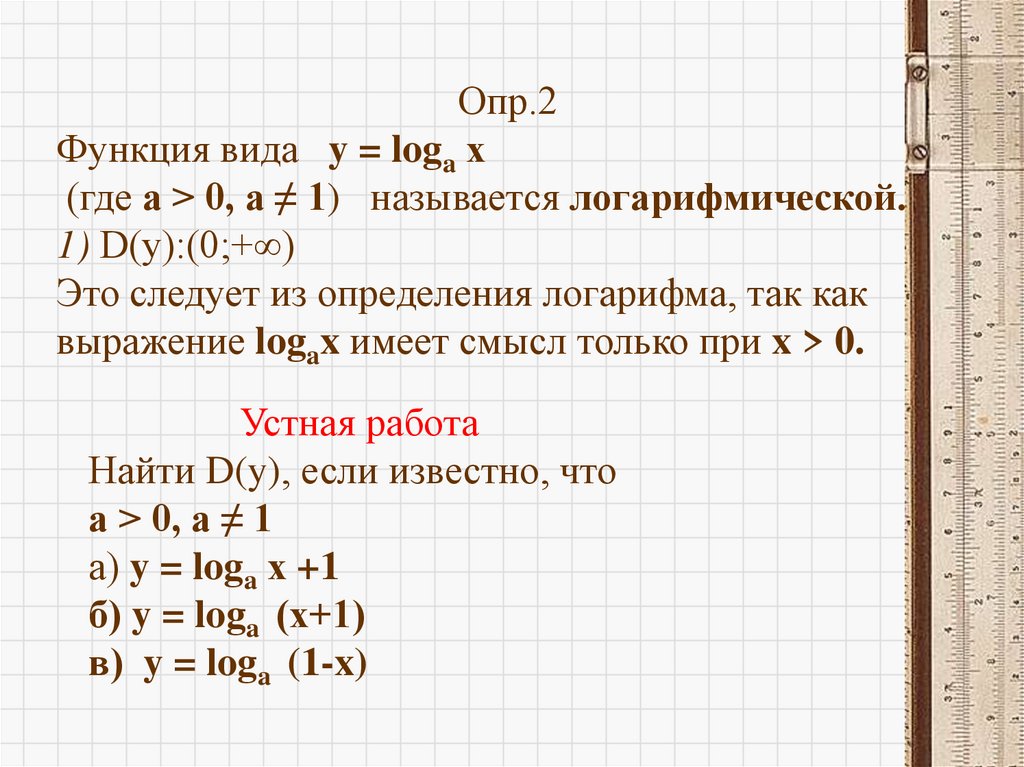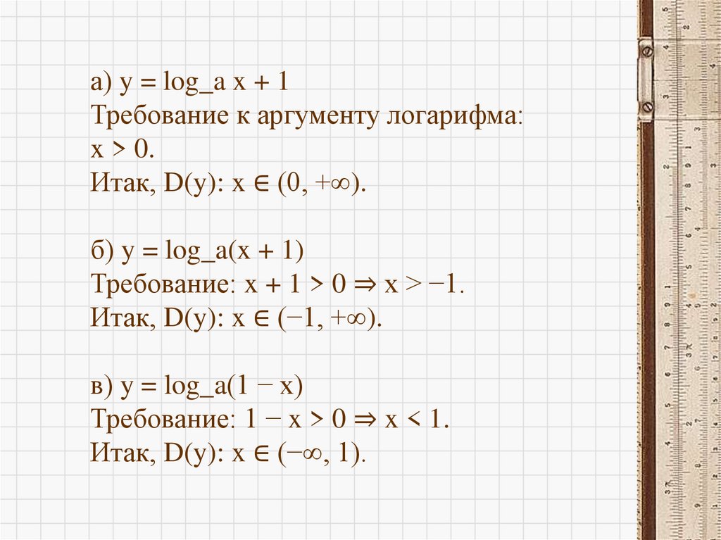 а) y = log_a x + 1Требование к аргументу логарифма: