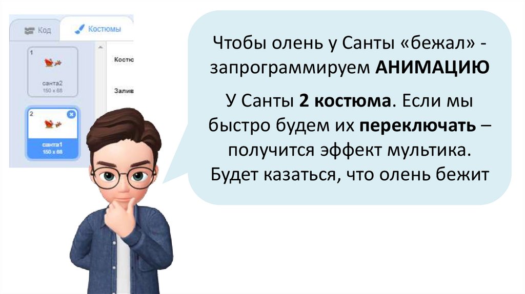 Чтобы олень у Санты «бежал» запрограммируем АНИМАЦИЮУ Санты 2 костюма. Если мы
