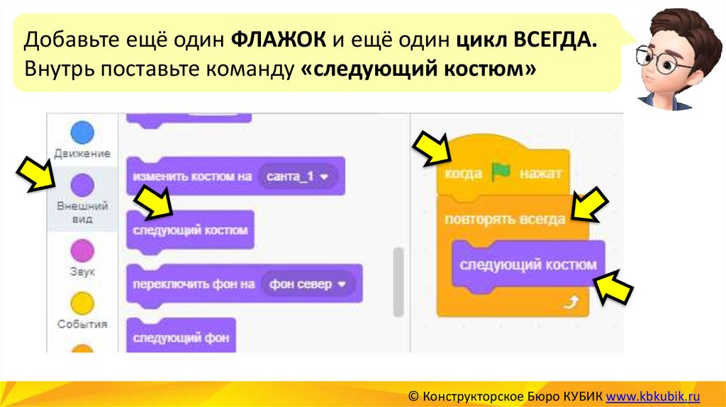 Добавьте ещё один ФЛАЖОК и ещё один цикл ВСЕГДА.Внутрь поставьте команду «следующий костюм»