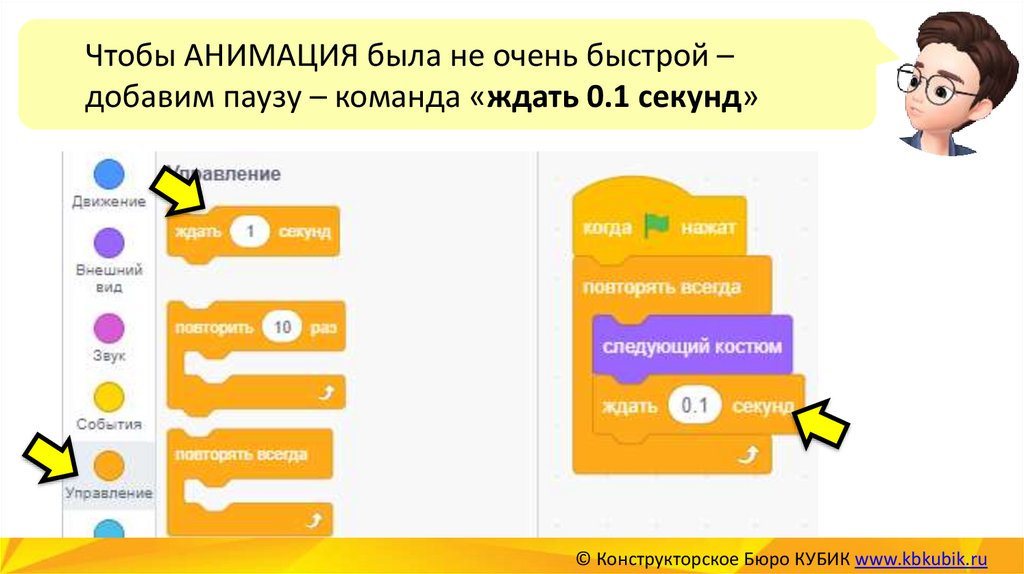 Чтобы АНИМАЦИЯ была не очень быстрой –добавим паузу – команда «ждать 0.1 секунд»