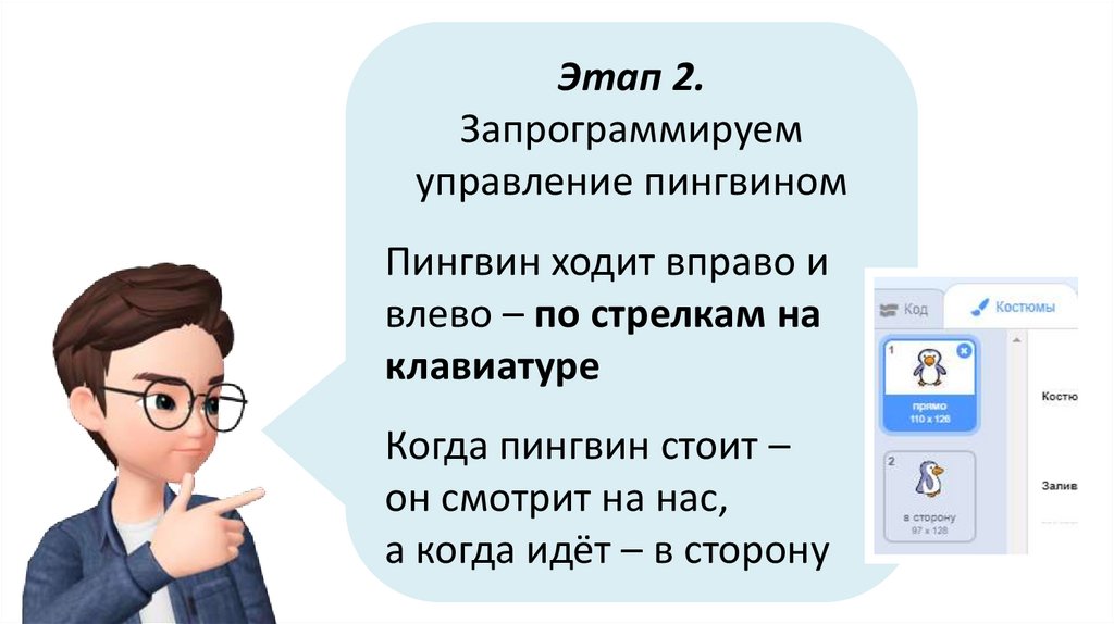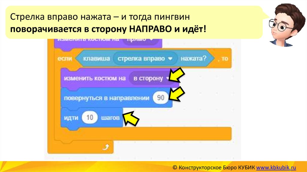 Стрелка вправо нажата – и тогда пингвинповорачивается в сторону НАПРАВО и идёт!