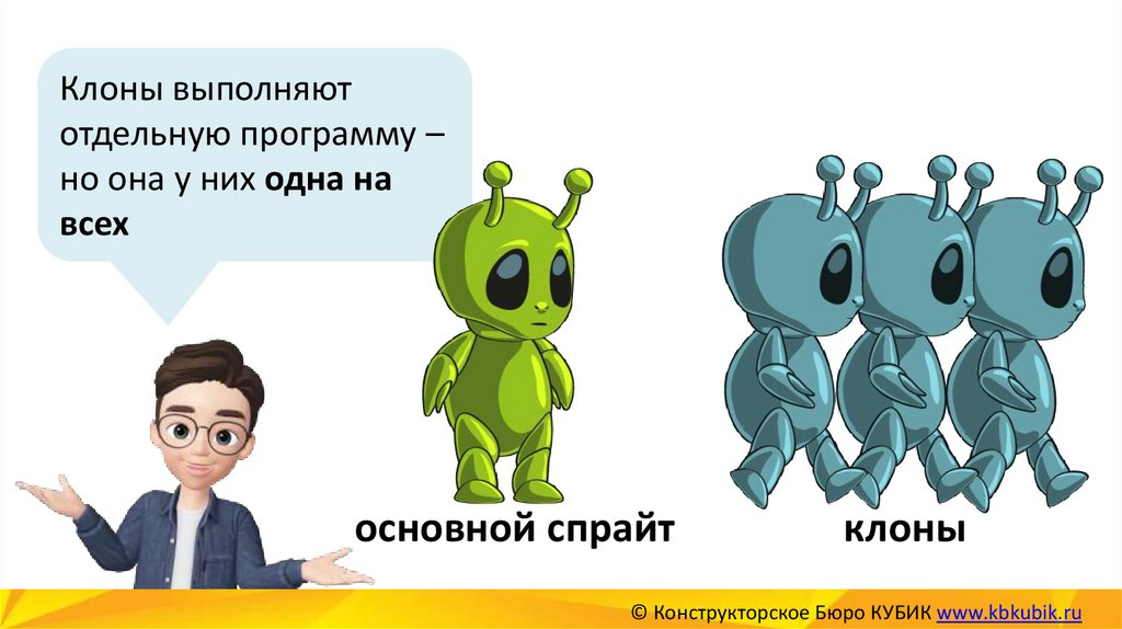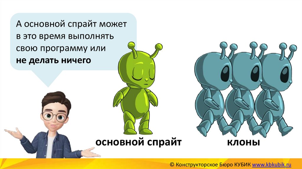 Теперь запрограммируем клона – его программаначинается отдельно. И сначала клон ПРЯЧЕТСЯ