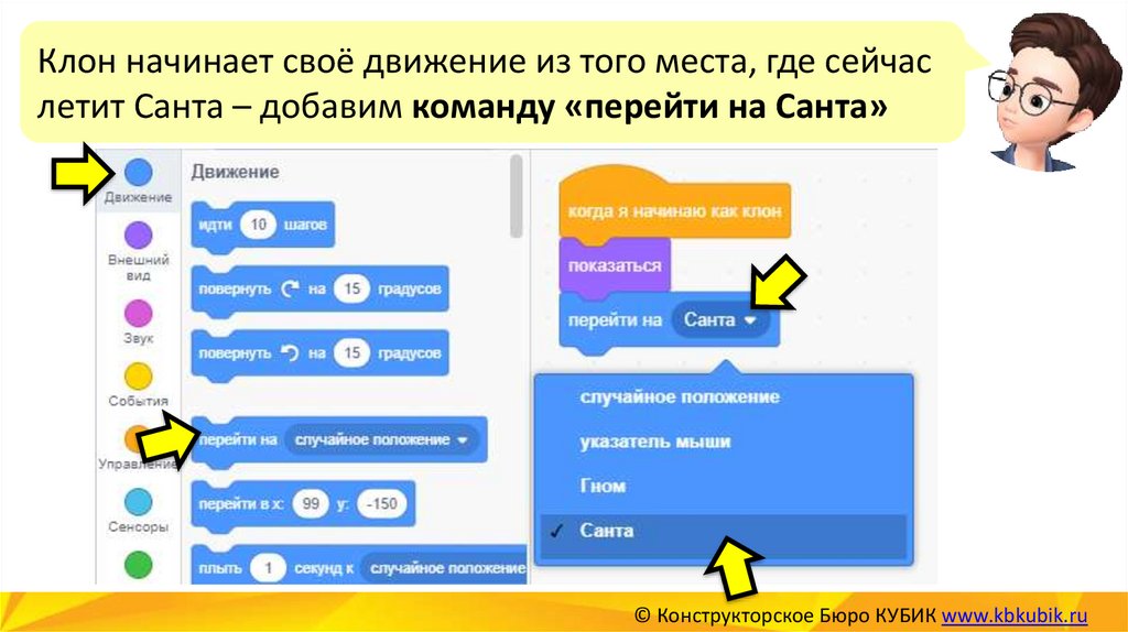 Клон начинает своё движение из того места, где сейчаслетит Санта – добавим команду «перейти на Санта»