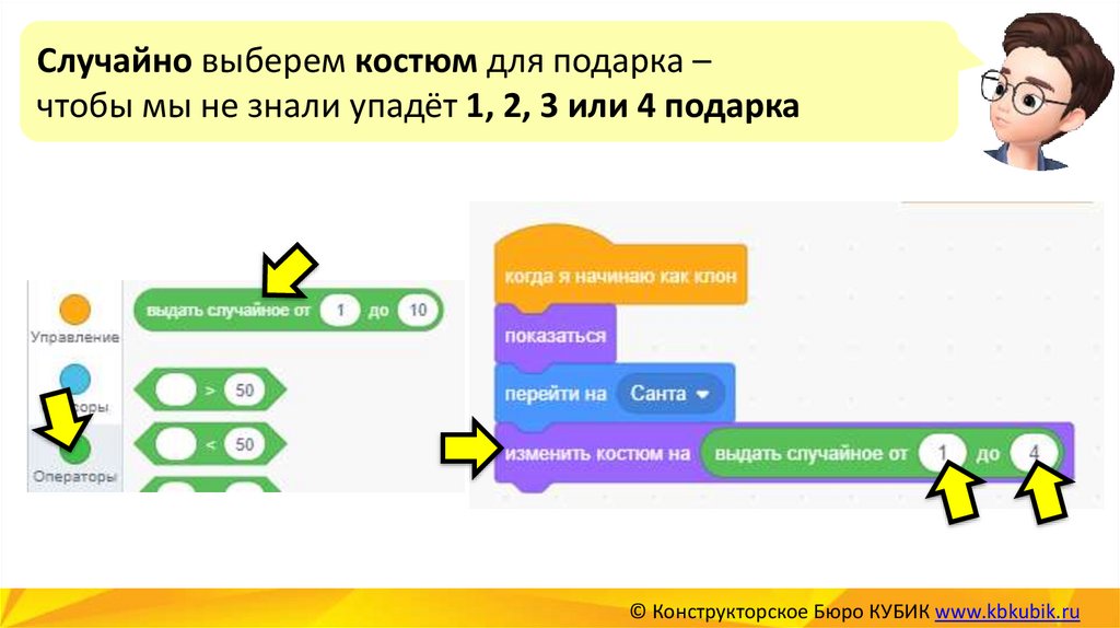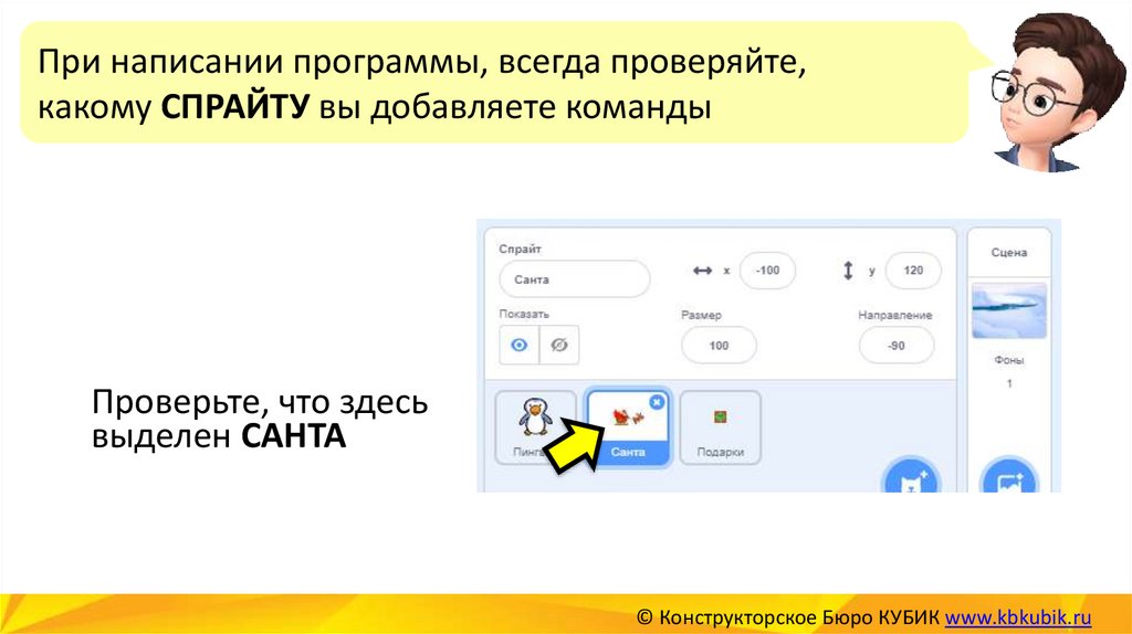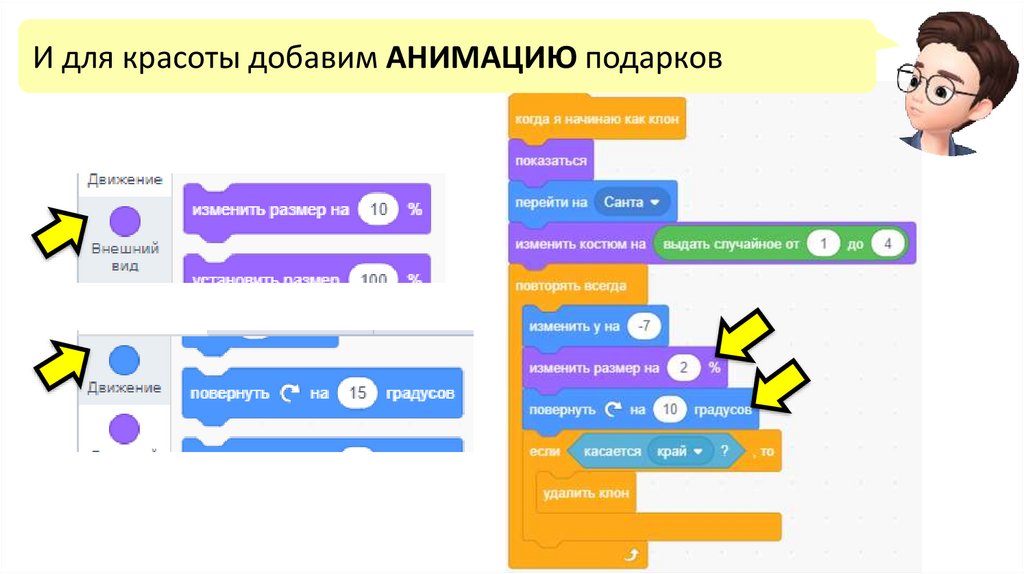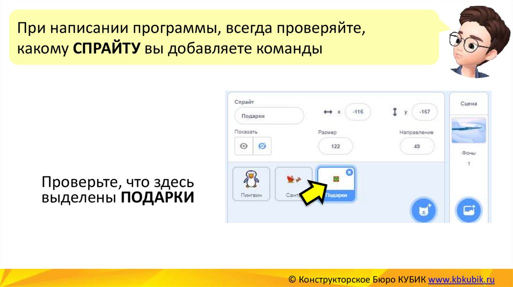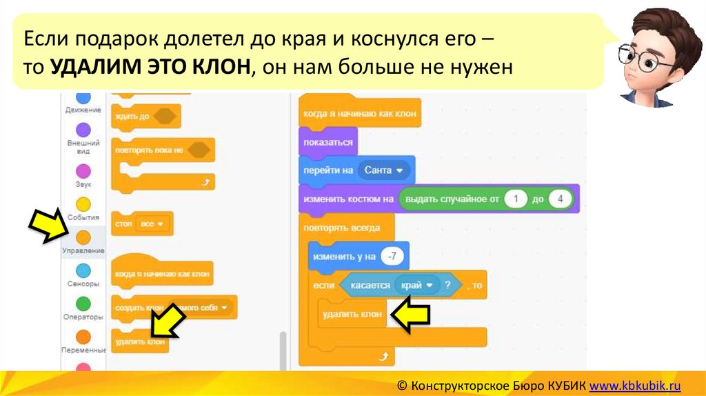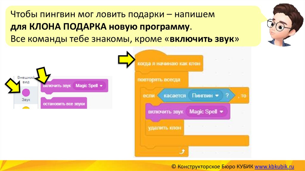 Чтобы пингвин мог ловить подарки – напишемдля КЛОНА ПОДАРКА новую программу.