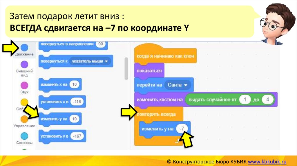 Затем подарок летит вниз :ВСЕГДА сдвигается на –7 по координате Y