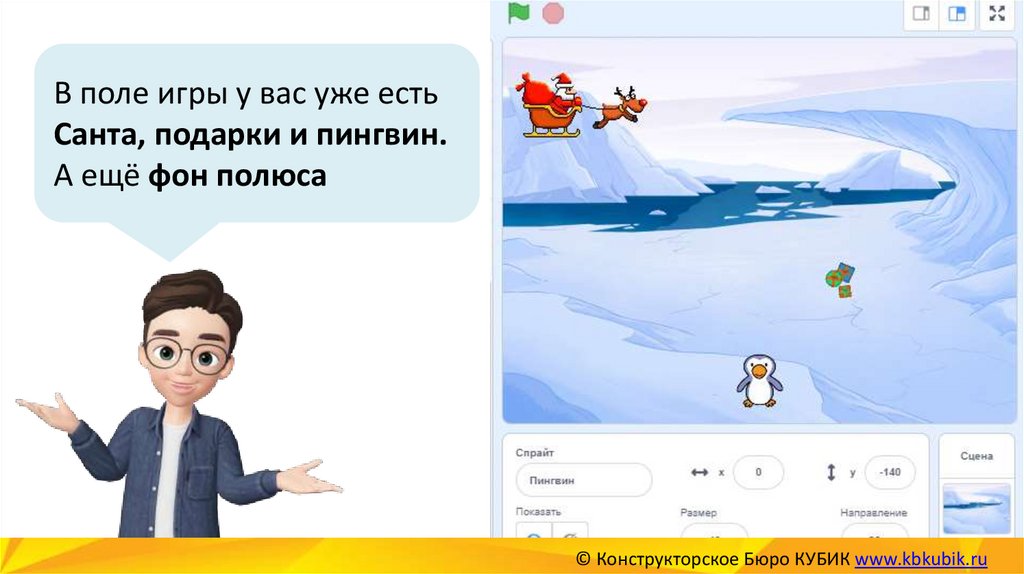 В поле игры у вас уже естьСанта, подарки и пингвин.