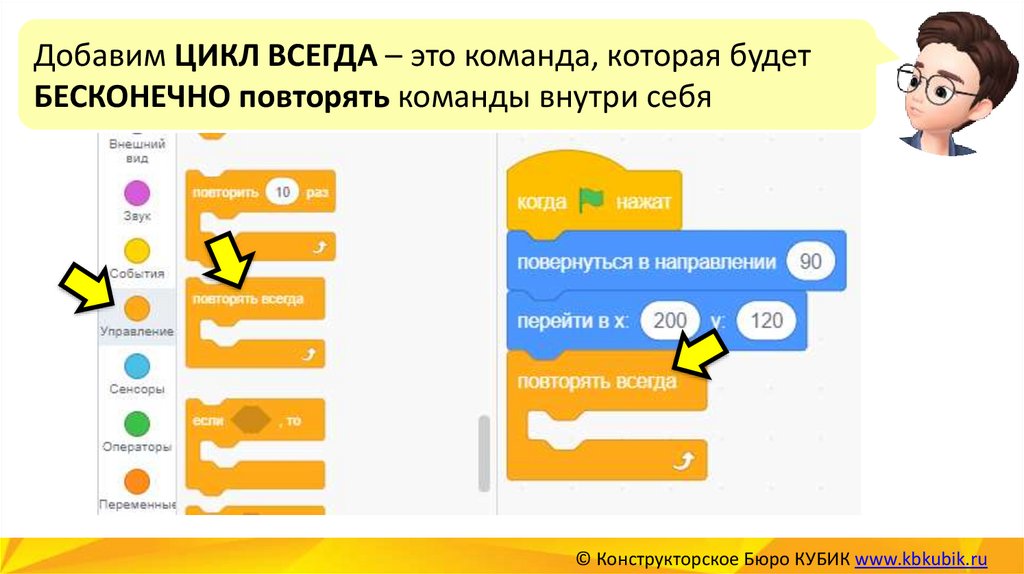 Добавим ЦИКЛ ВСЕГДА – это команда, которая будетБЕСКОНЕЧНО повторять команды внутри себя