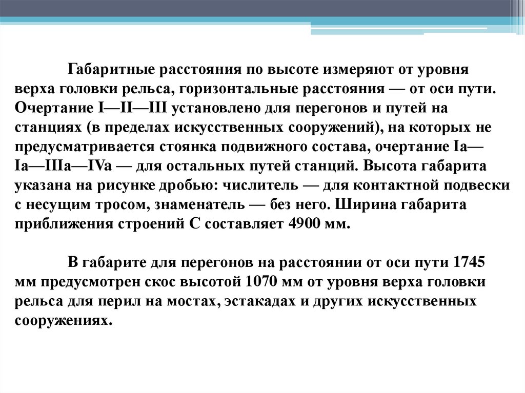 Габаритные расстояния по высоте измеряют от уровняверха головки рельса, горизонтальные расстояния — от оси пути.