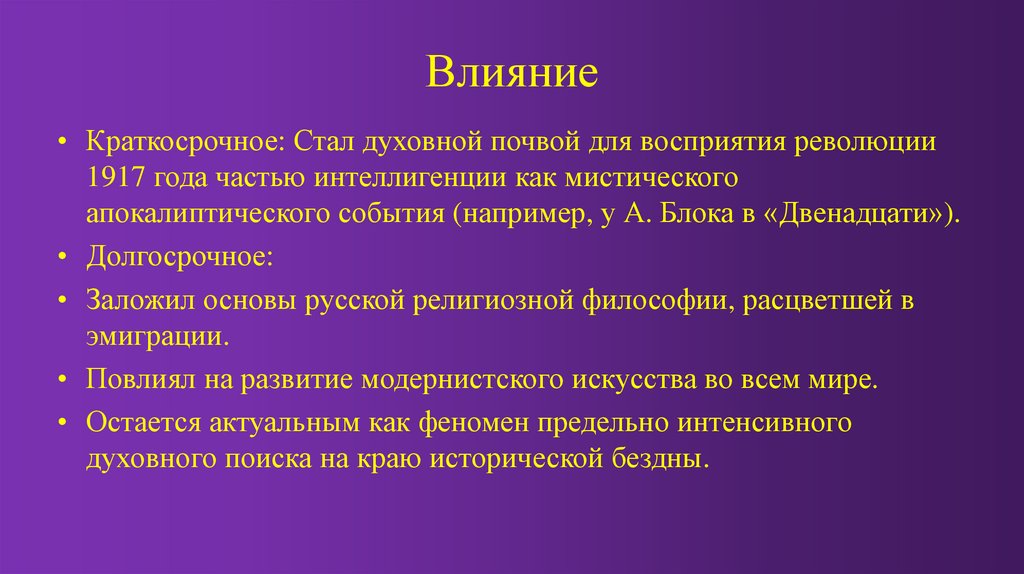 Влияние• Краткосрочное: Стал духовной почвой для восприятия революции