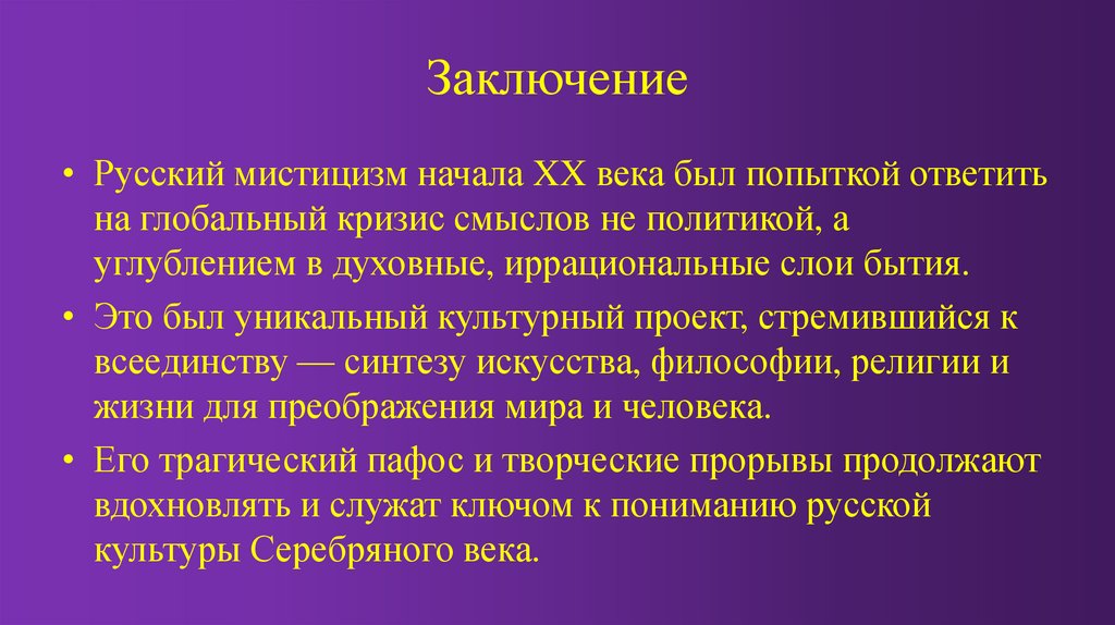 Заключение• Русский мистицизм начала XX века был попыткой ответить