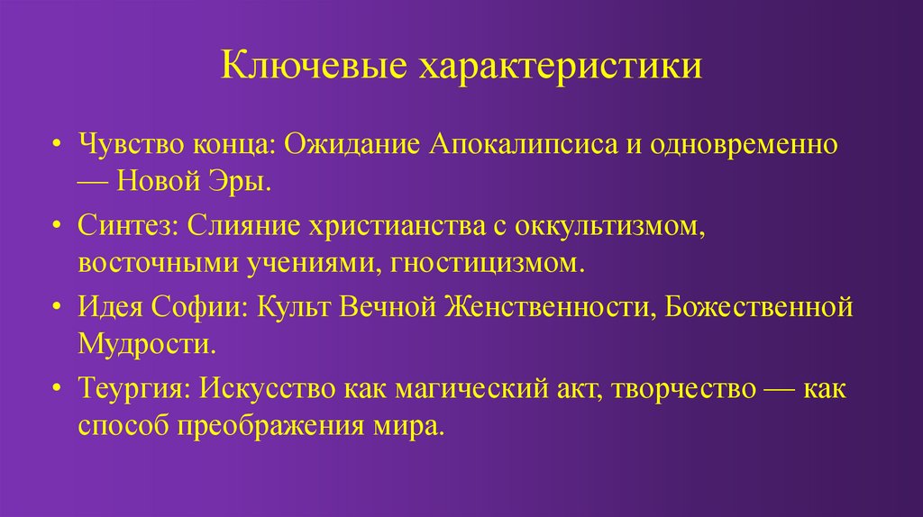 Ключевые характеристики• Чувство конца: Ожидание Апокалипсиса и одновременно