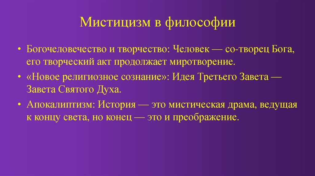 Мистицизм в философии• Богочеловечество и творчество: Человек — со-творец Бога,