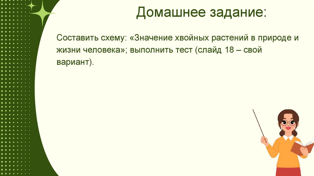 Домашнее задание:Составить схему: «Значение хвойных растений в природе и