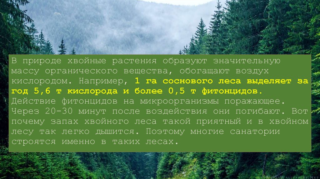 В природе хвойные растения образуют значительнуюмассу органического вещества, обогащают воздух