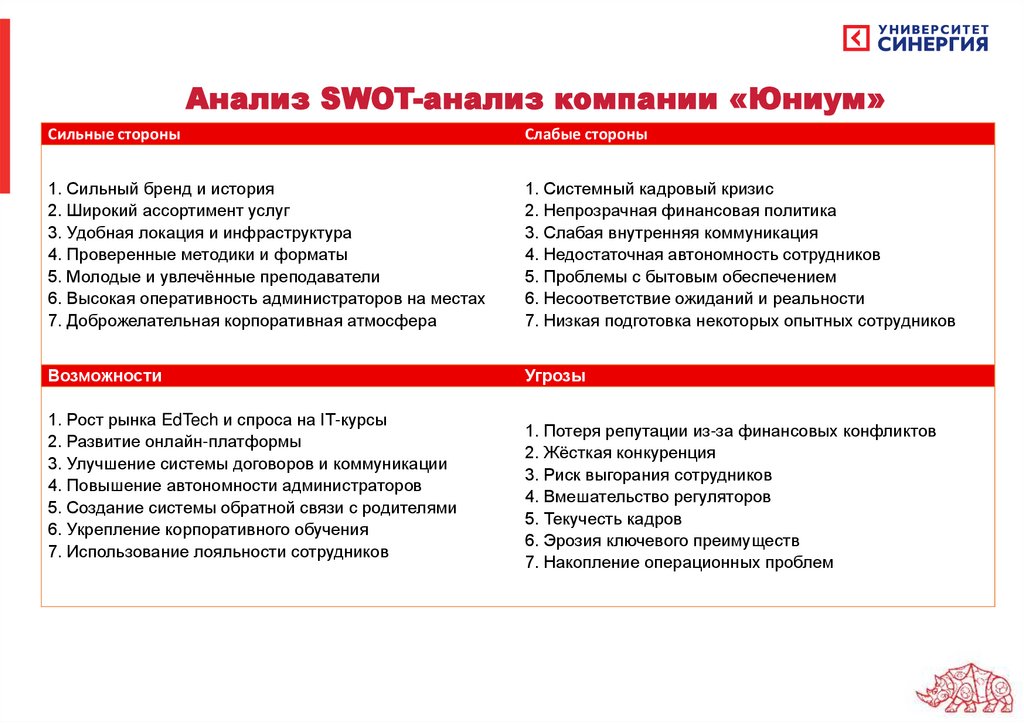 Анализ SWOT-анализ компании «Юниум»Сильные стороны