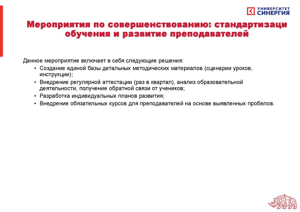 • Внедрение регулярной аттестации (раз в квартал), анализ образовательной