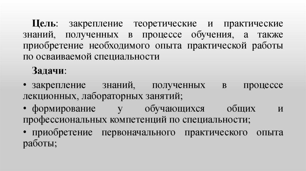 Цель: закрепление теоретические и практическиезнаний, полученных в процессе обучения, а также