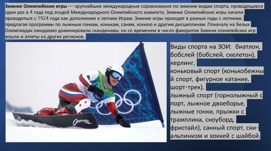 Зимние Олимпийские игры — крупнейшие международные соревнования по зимним видам спорта, проводящиесяодин раз в 4 года под эгидой Международного Олимпийского комитета. Зимние Олимпийские игры начали