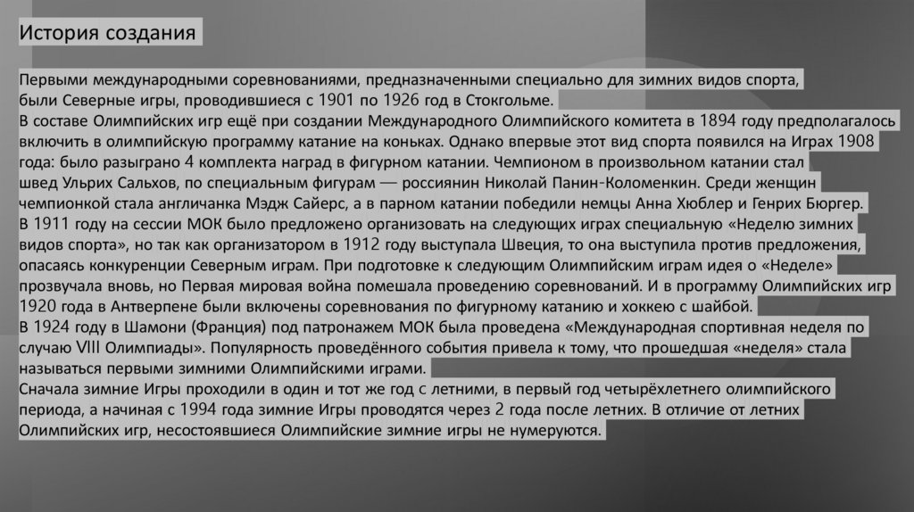 История созданияПервыми международными соревнованиями, предназначенными специально для зимних видов спорта,