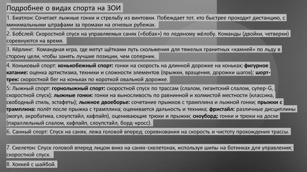 Подробнее о видах спорта на ЗОИ1. Биатлон: Сочетает лыжные гонки и стрельбу из винтовки. Побеждает тот, кто быстрее проходит дистанцию, с