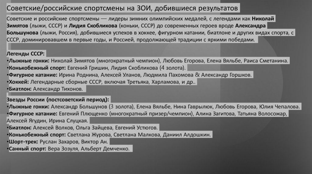 Советские/российские спортсмены на ЗОИ, добившиеся результатовСоветские и российские спортсмены — лидеры зимних олимпийских медалей, с легендами как Николай