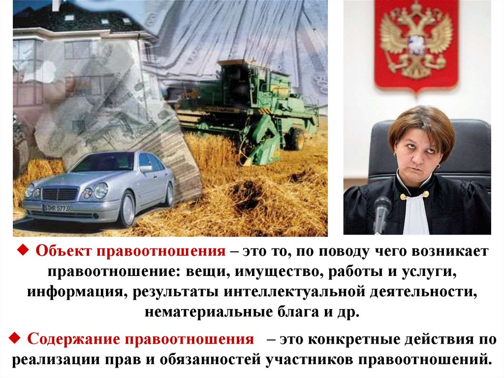 Объект правоотношения – это то, по поводу чего возникаетправоотношение: вещи, имущество, работы и услуги,