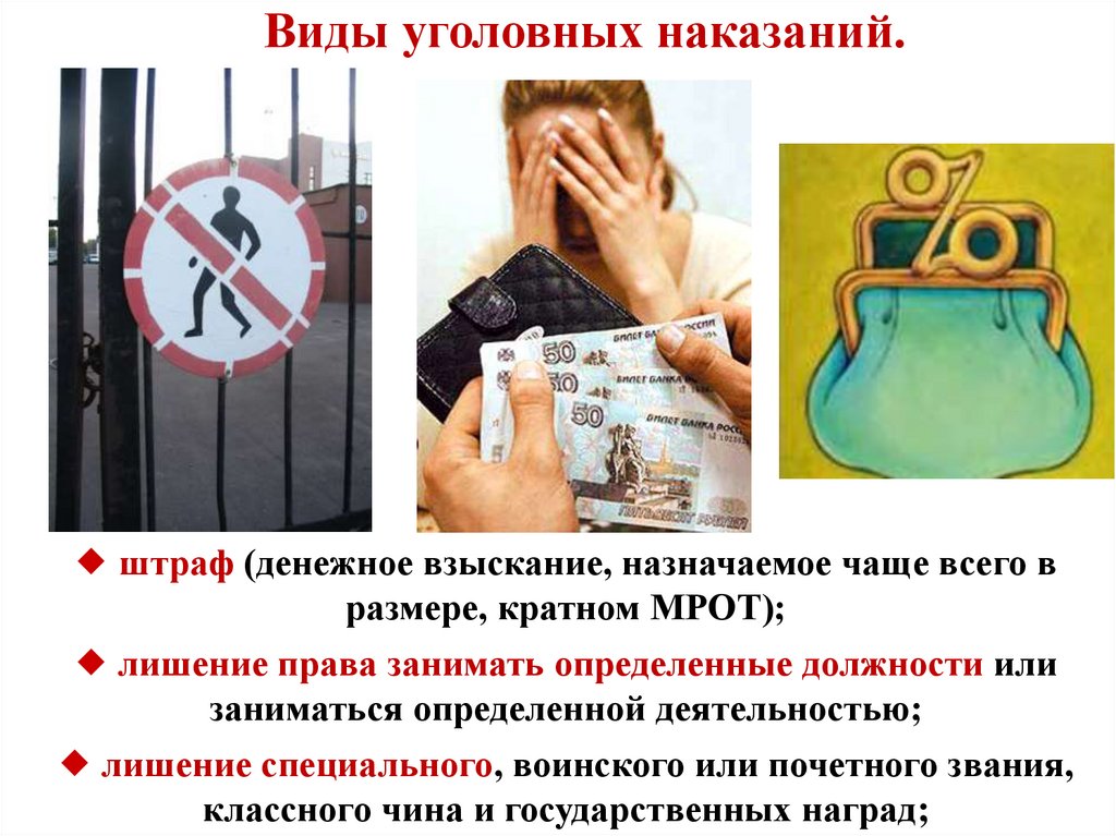 Виды уголовных наказаний.штраф (денежное взыскание, назначаемое чаще всего в