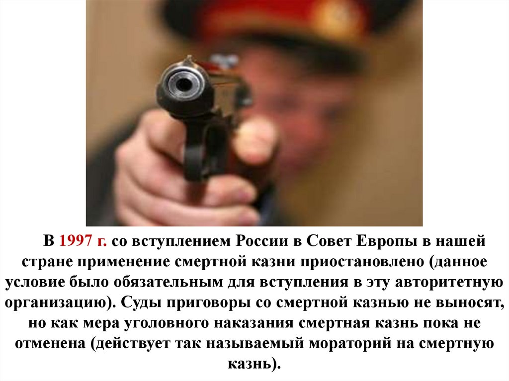 В 1997 г. со вступлением России в Совет Европы в нашейстране применение смертной казни приостановлено (данное