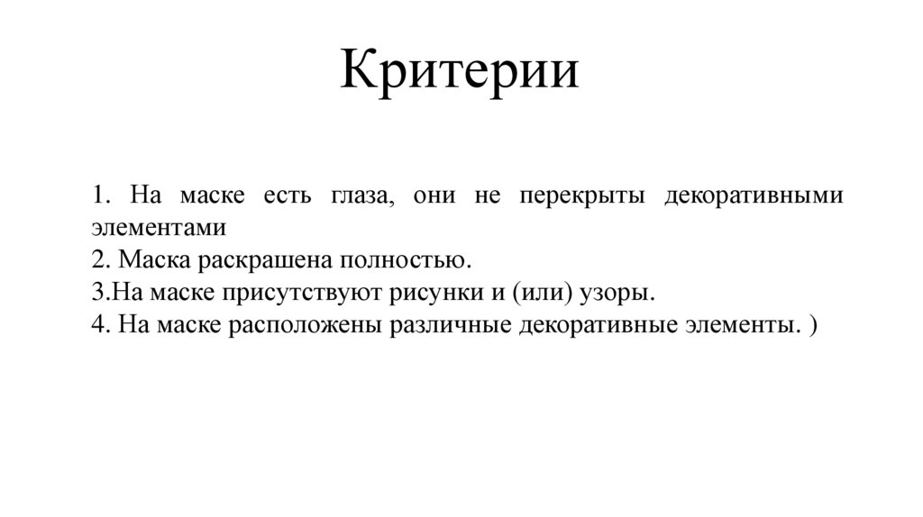 Критерии1. На маске есть глаза, они не перекрыты декоративными