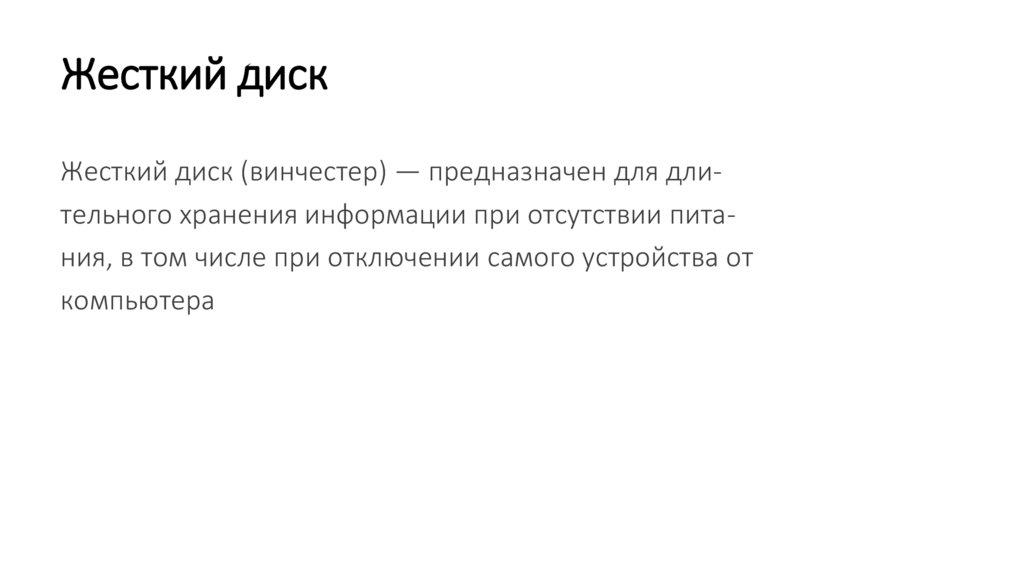 Жесткий дискЖесткий диск (винчестер) — предназначен для длительного хранения информации при отсутствии питания, в том числе при отключении самого устройства от