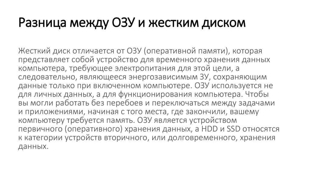 Разница между ОЗУ и жестким дискомЖесткий диск отличается от ОЗУ (оперативной памяти), которая
