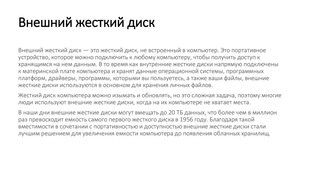 Внешний жесткий дискВнешний жесткий диск — это жесткий диск, не встроенный в компьютер. Это портативное