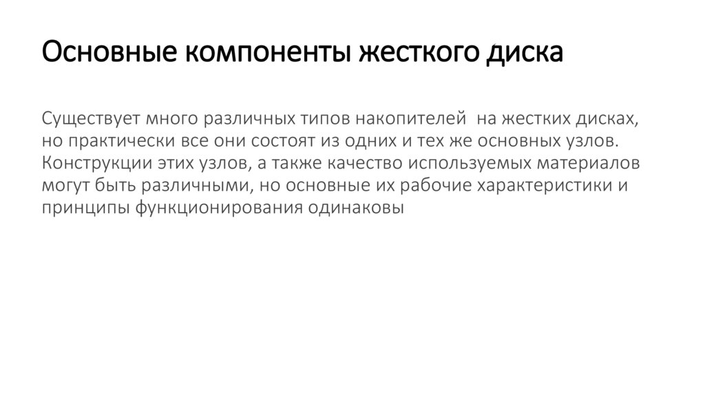 Основные компоненты жесткого дискаСуществует много различных типов накопителей на жестких дисках,