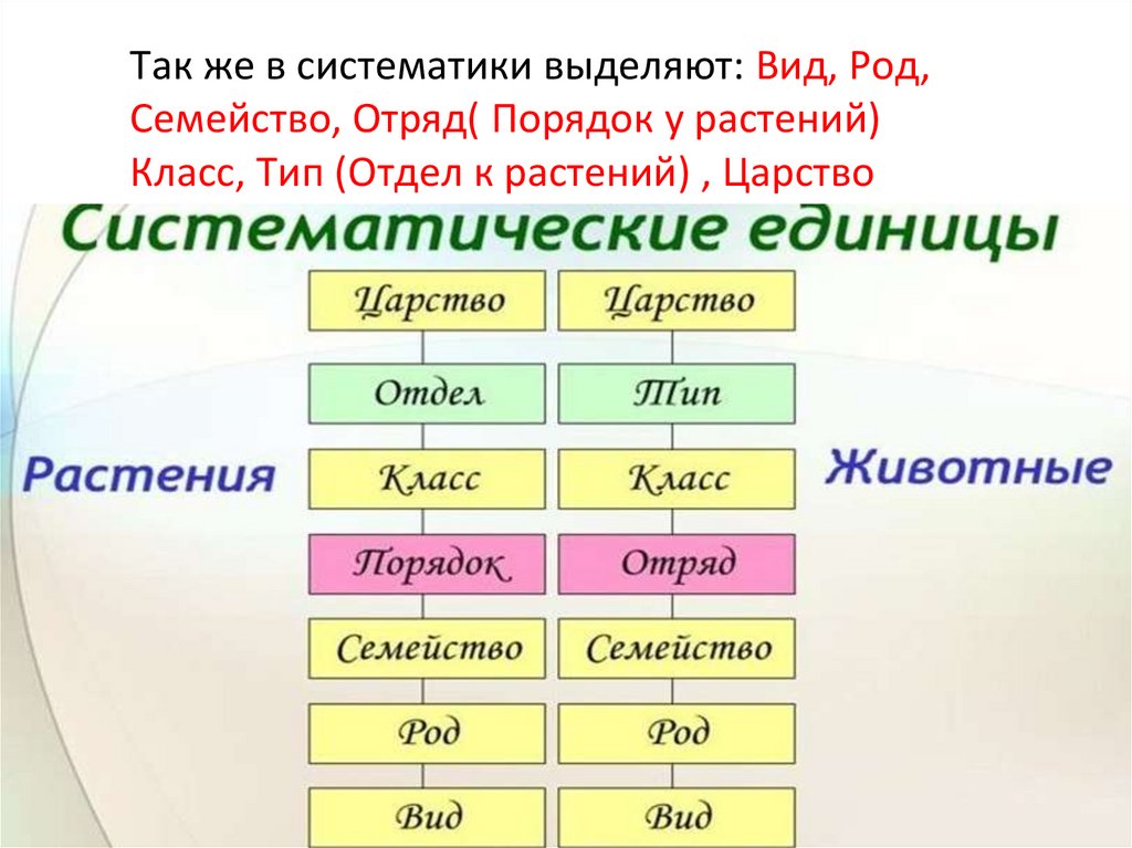 Так же в систематики выделяют: Вид, Род,Семейство, Отряд( Порядок у растений)