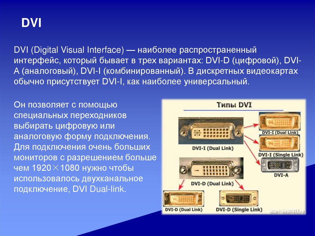 интерфейс, который бывает в трех вариантах: DVI-D (цифровой), DVIA (аналоговый), DVI-I (комбинированный). В дискретных видеокартах