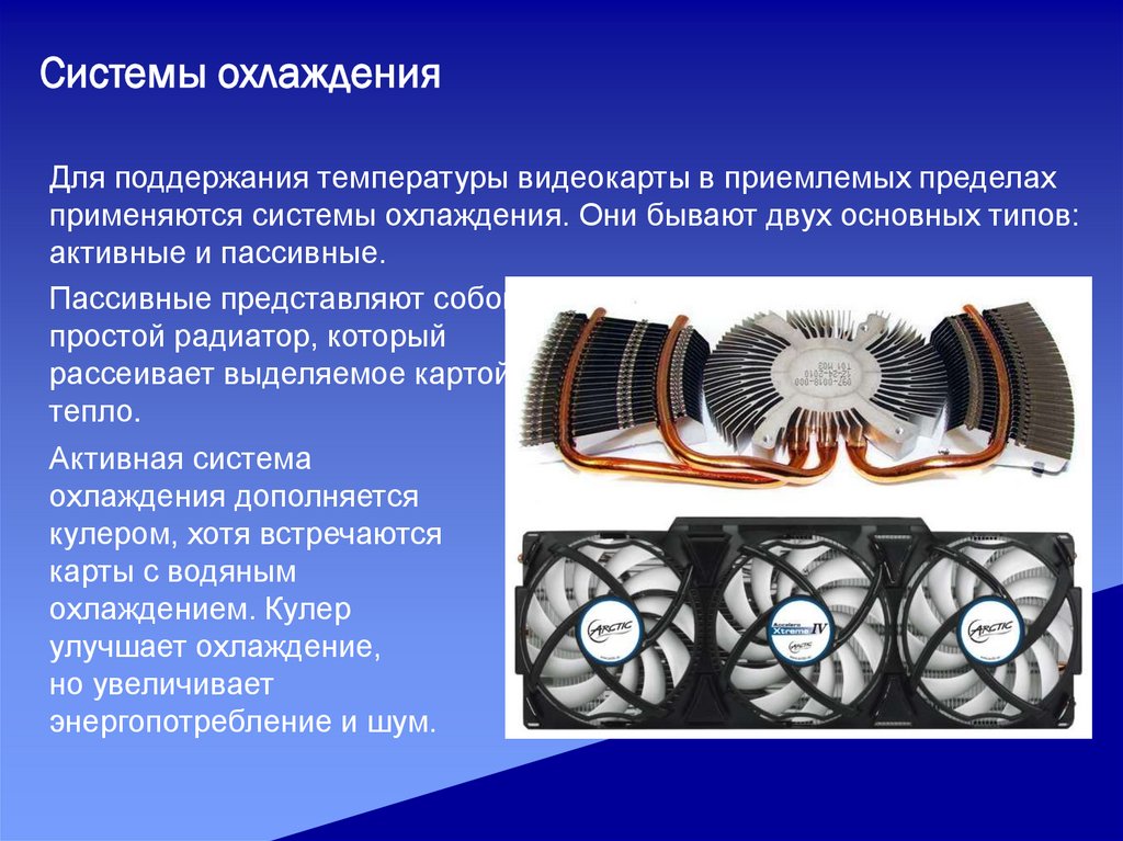 Системы охлажденияДля поддержания температуры видеокарты в приемлемых пределах