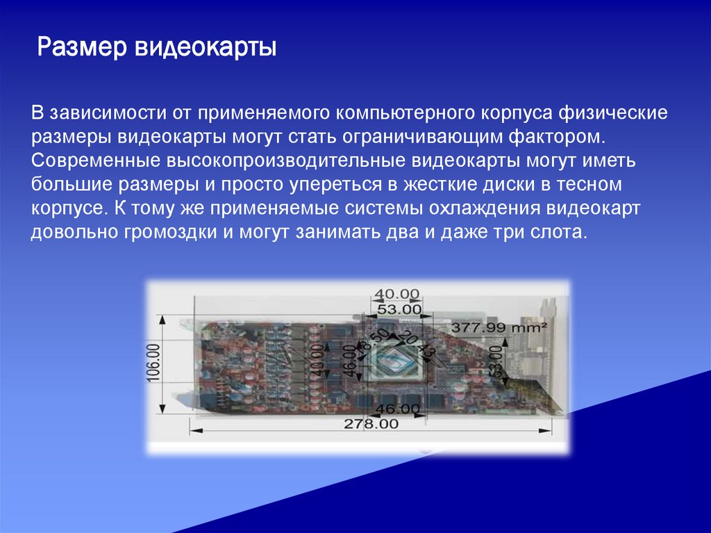 Размер видеокартыВ зависимости от применяемого компьютерного корпуса физические