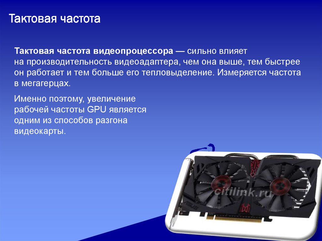 Тактовая частотаТактовая частота видеопроцессора — сильно влияет
