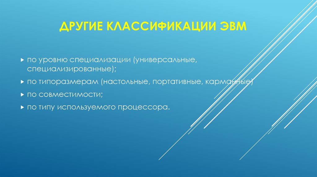 ДРУГИЕ КЛАССИФИКАЦИИ ЭВМпо уровню специализации (универсальные,