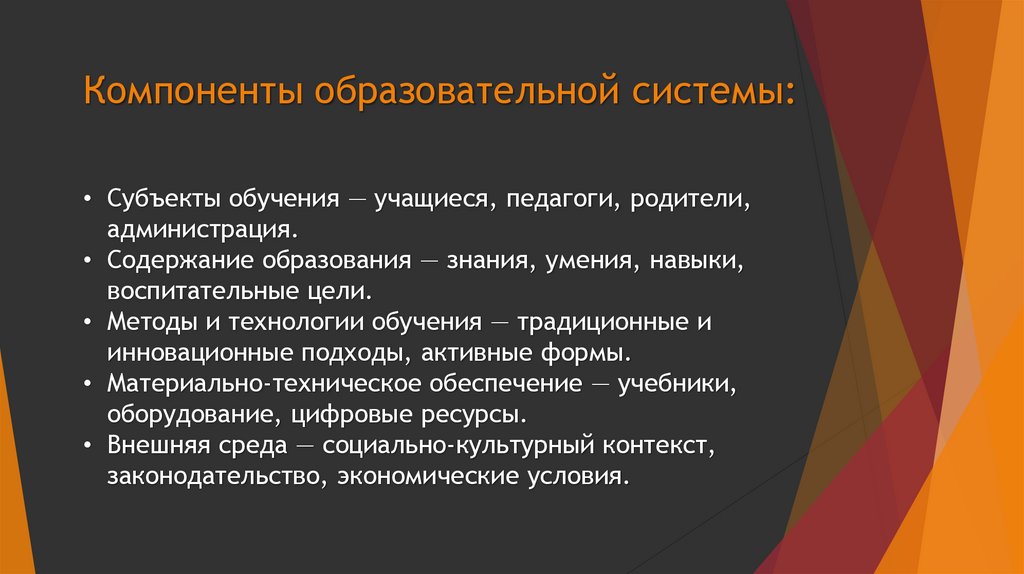Компоненты образовательной системы:• Субъекты обучения — учащиеся, педагоги, родители,