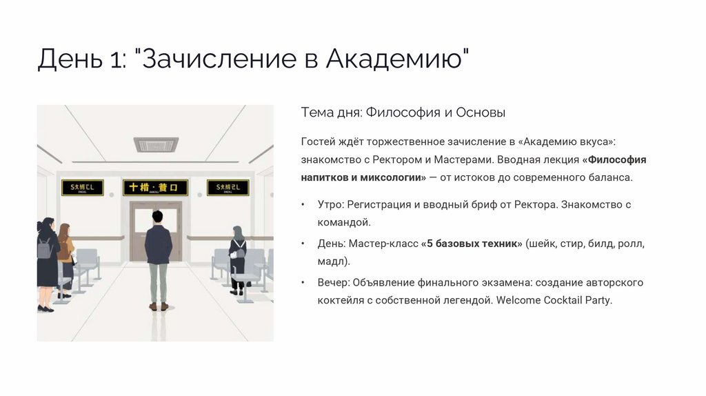 День 1: "Зачисление в Академию"Тема дня: Философия и Основы