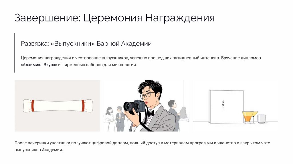 Завершение: Церемония НагражденияРазвязка: «Выпускники» Барной Академии