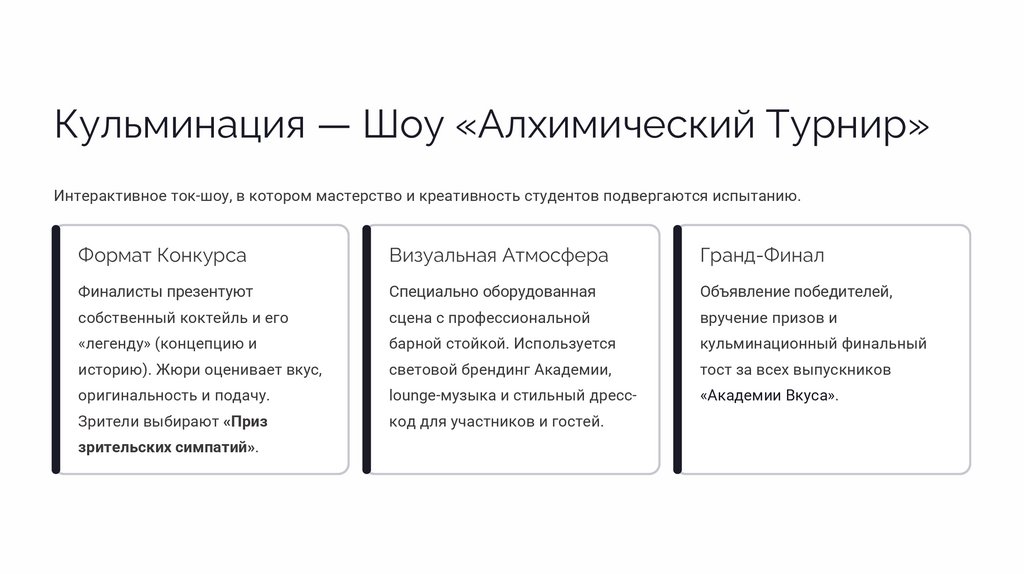 Кульминация — Шоу «Алхимический Турнир»Интерактивное ток-шоу, в котором мастерство и креативность студентов подвергаются испытанию.