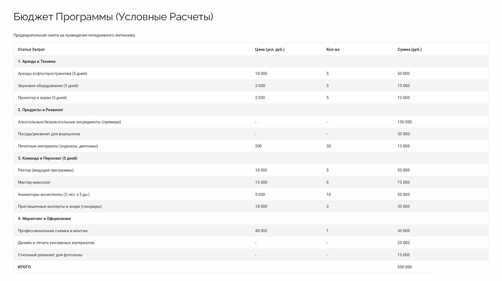 Бюджет Программы (Условные Расчеты)Предварительная смета на проведение пятидневного интенсива.