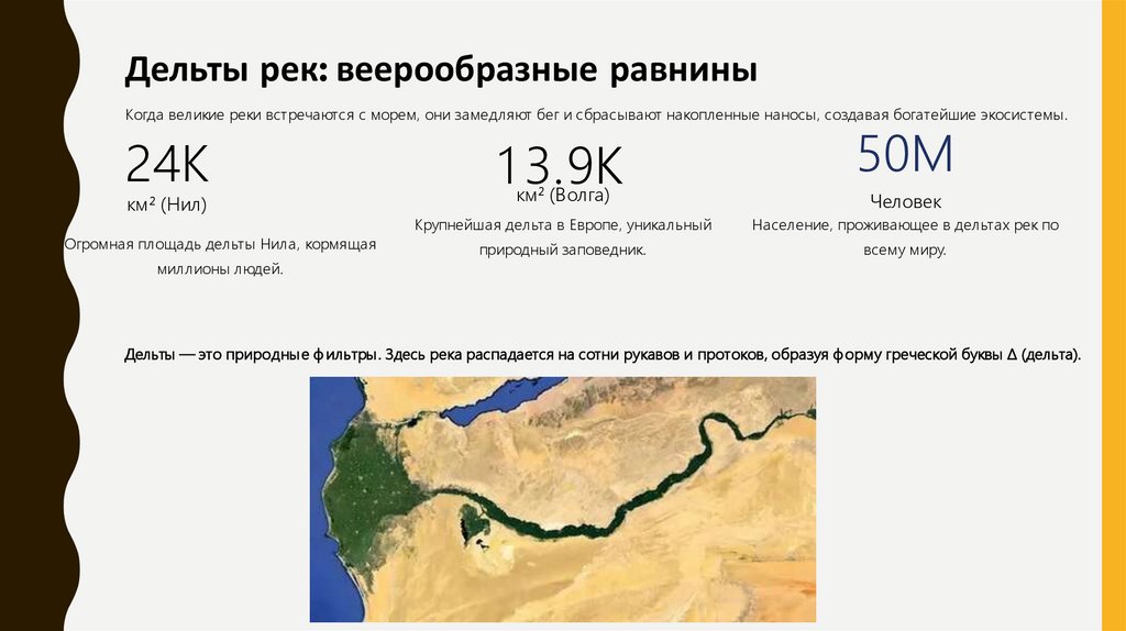 Дельты — это природны е ф ильтры. Здесь река распадается на сотни рукавов и протоков, образуя ф орму греческой буквы Δ (дельта).