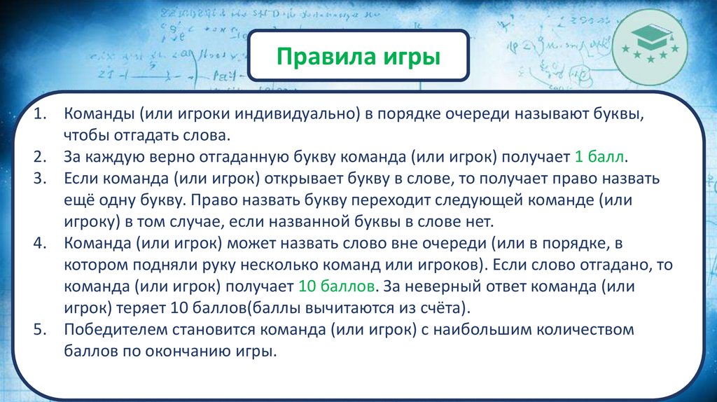 Правила игры1. Команды (или игроки индивидуально) в порядке очереди называют буквы,