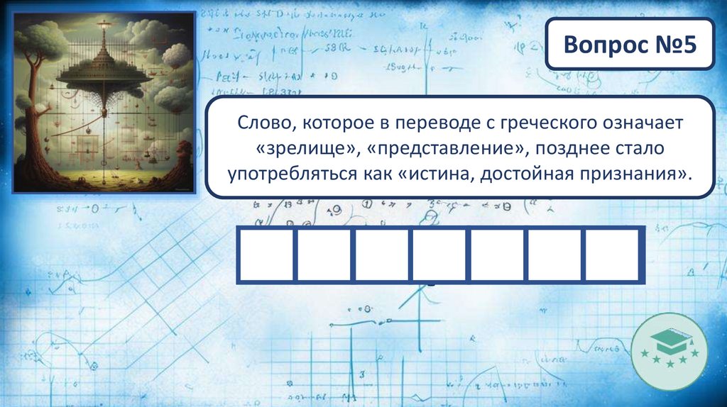 5. Слово, которое в переводе с греческого означает «зрелище», «представление», позднее стало употребляться как «истина, достойная
