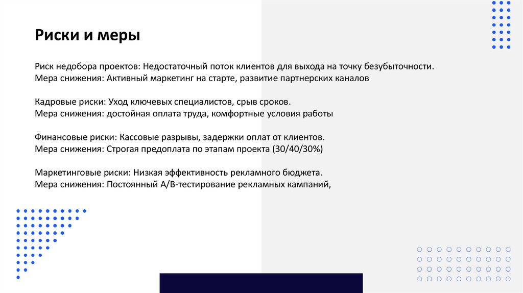 Риски и мерыРиск недобора проектов: Недостаточный поток клиентов для выхода на точку безубыточности.