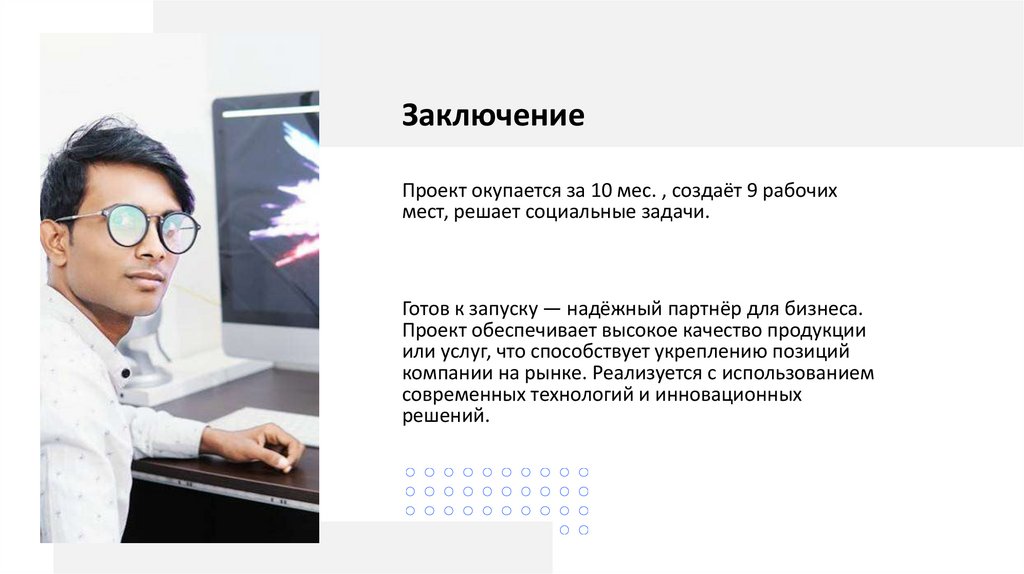 ЗаключениеПроект окупается за 10 мес. , создаёт 9 рабочих