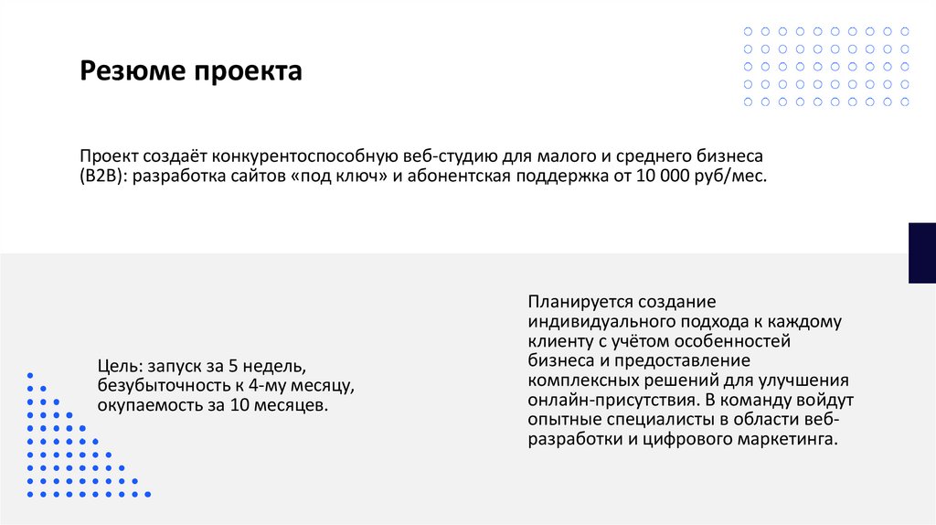 Резюме проектаПроект создаёт конкурентоспособную веб-студию для малого и среднего бизнеса